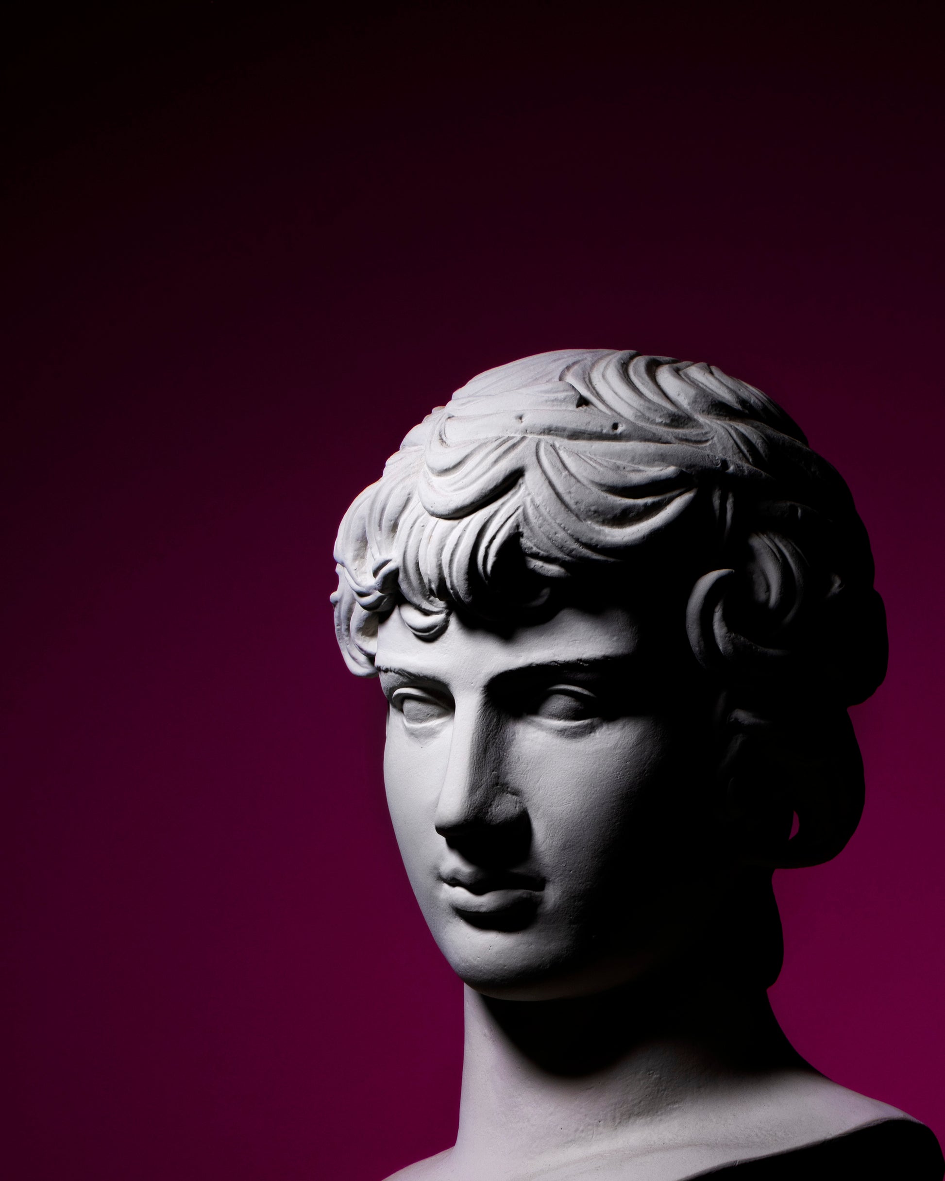 Esalta la bellezza senza tempo dell'arte classica con un tocco contemporaneo. Questo poster raffigura un busto scultoreo bianco, scolpito nei dettagli e illuminato da luci drammatiche che ne esaltano la forza e la grazia. Lo sfondo bordeaux crea un contrasto visivo potente e sofisticato, rendendolo un elemento d'arredo ideale per ambienti moderni, gallerie domestiche o spazi creativi.