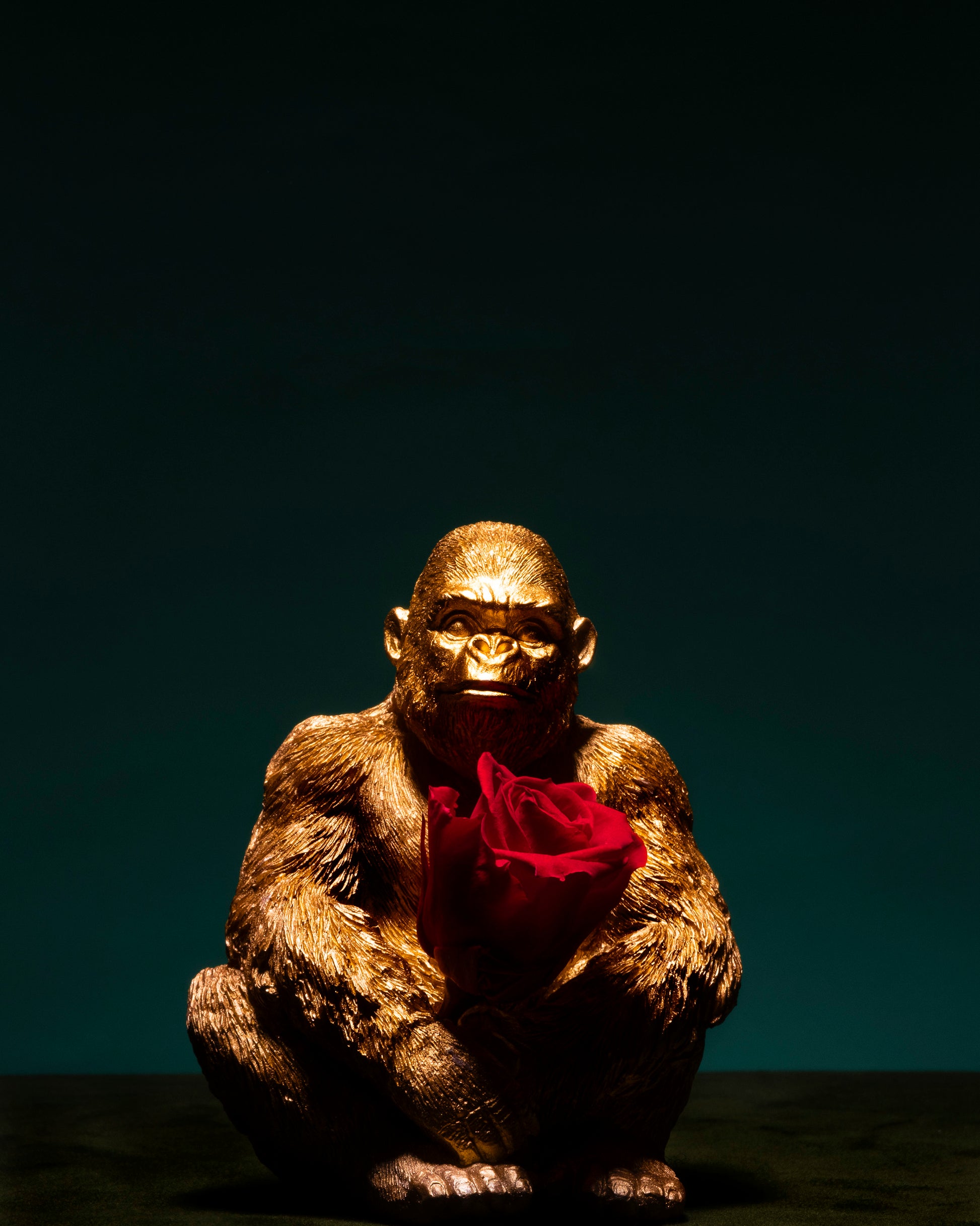 Aggiungi un tocco di originalità e mistero ai tuoi spazi con questo esclusivo poster artistico. Raffigurante una statua dorata di gorilla che stringe delicatamente una rosa rossa, questa immagine unisce forza e romanticismo in un contrasto sorprendente. Con uno sfondo scuro e drammatico che mette in risalto i dettagli metallici e il vibrante colore del fiore, questo poster è perfetto per ambienti contemporanei, creativi o minimalisti.