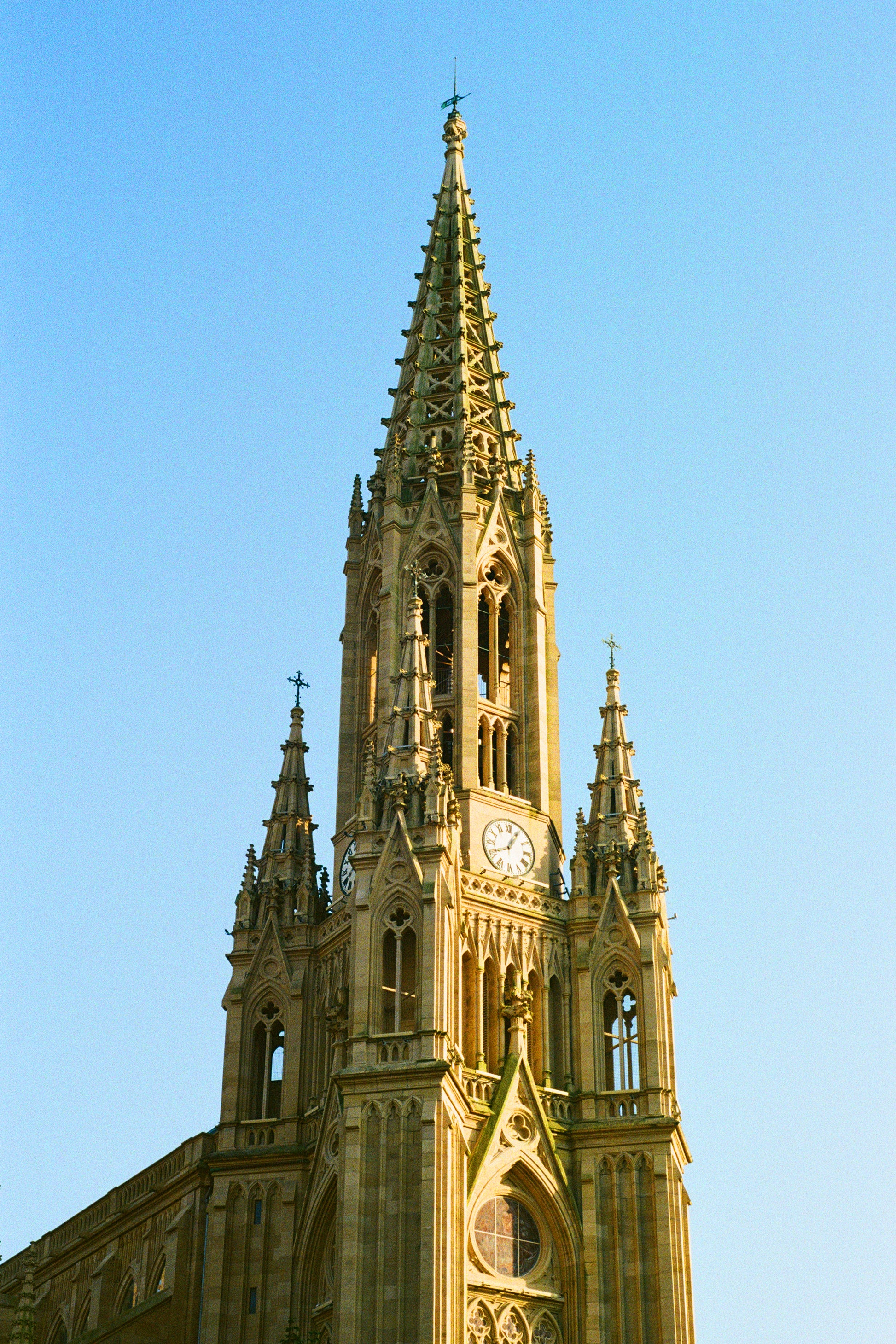 Un’imponente torre neogotica che si staglia contro un cielo limpido, illuminata dalla calda luce del tramonto. I dettagli architettonici e le sfumature dorate rendono questa fotografia un pezzo d’arte ideale per chi ama la bellezza delle grandi cattedrali europee.